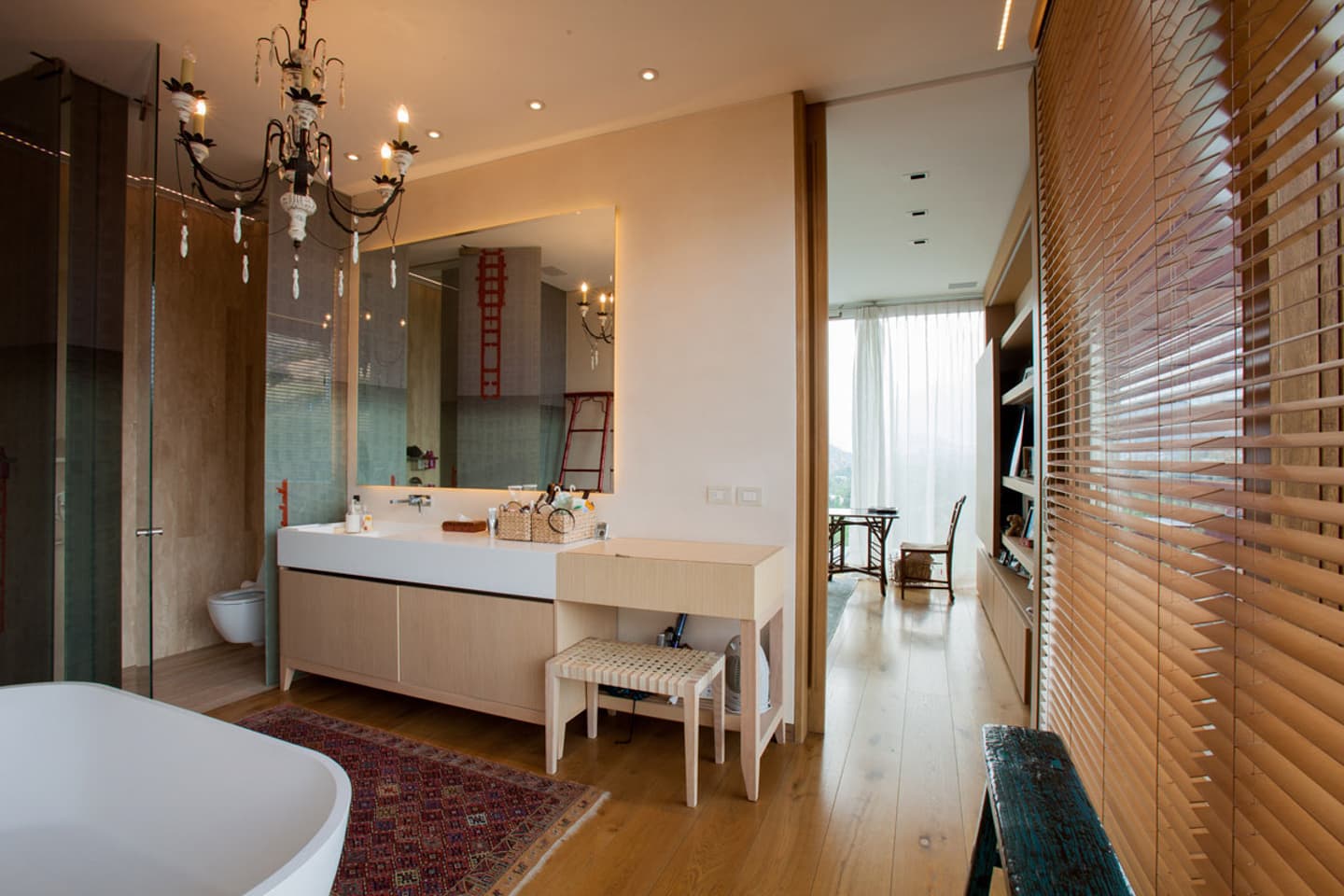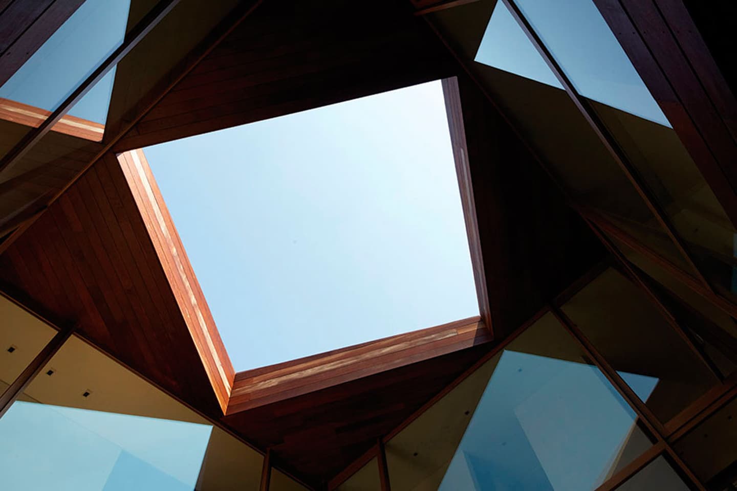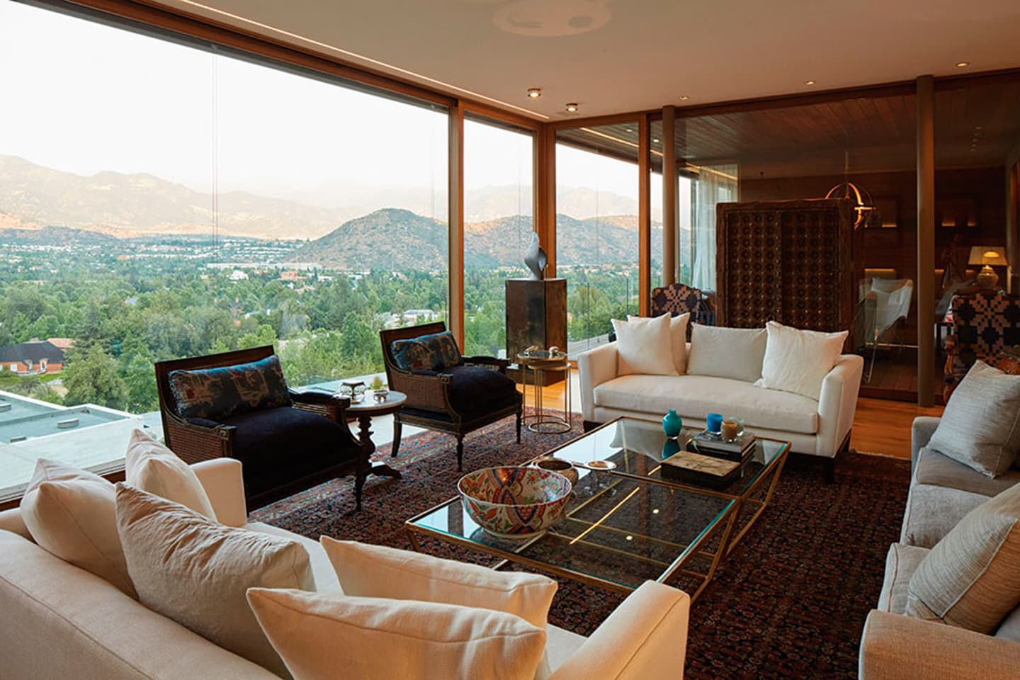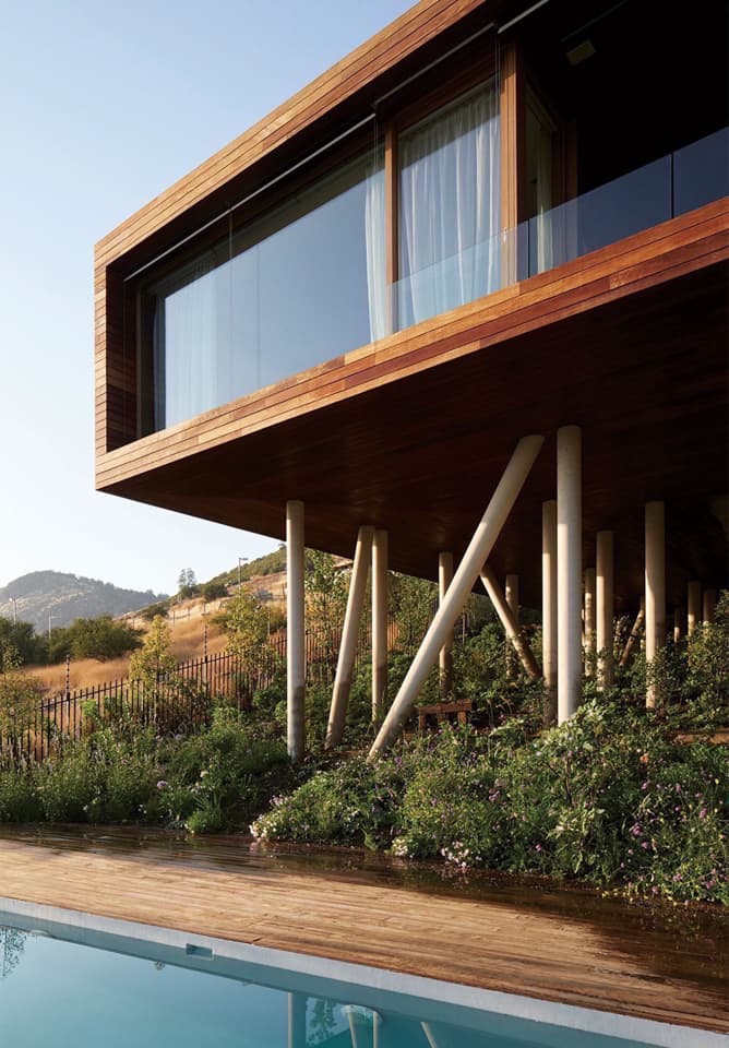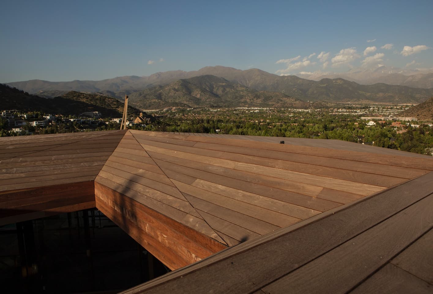 Además de sus espectaculares vistas, la Casa Esmeralda tiene atributos que la hacen única: una reinterpretación contemporánea del clásico patio romano, una base de pilares que la eleva a los pies del cerro Manquehue y una cubierta inspirada en el mineral de la esmeralda y su proceso de formación geométrica.