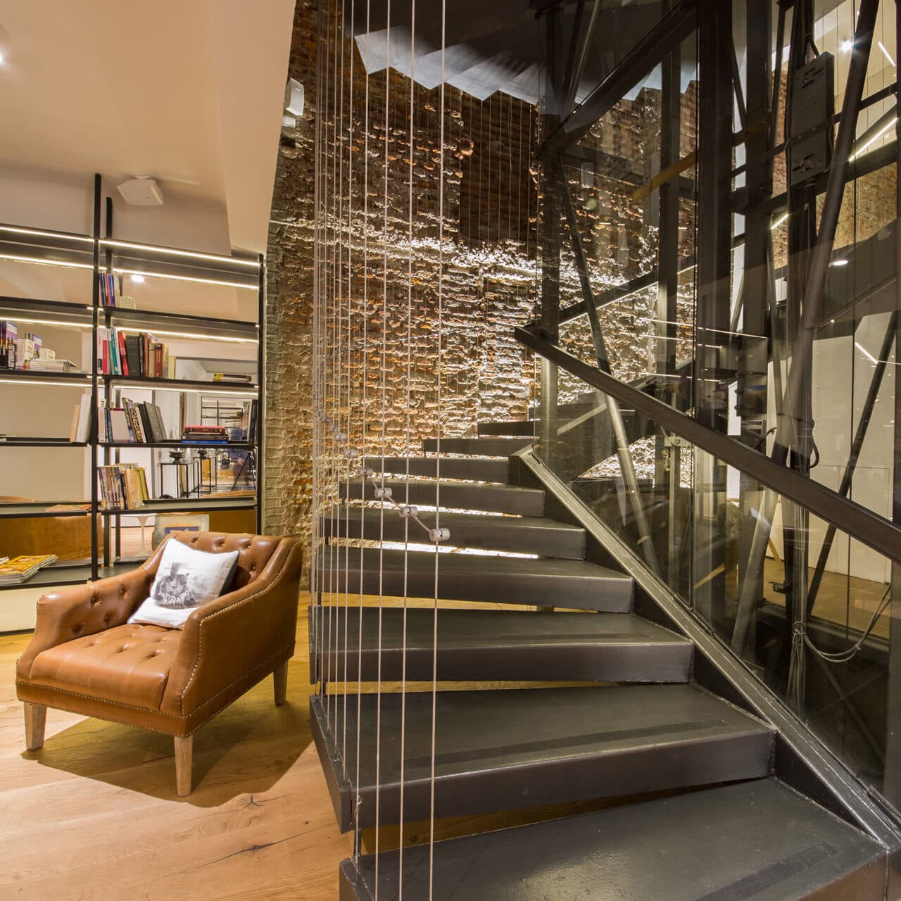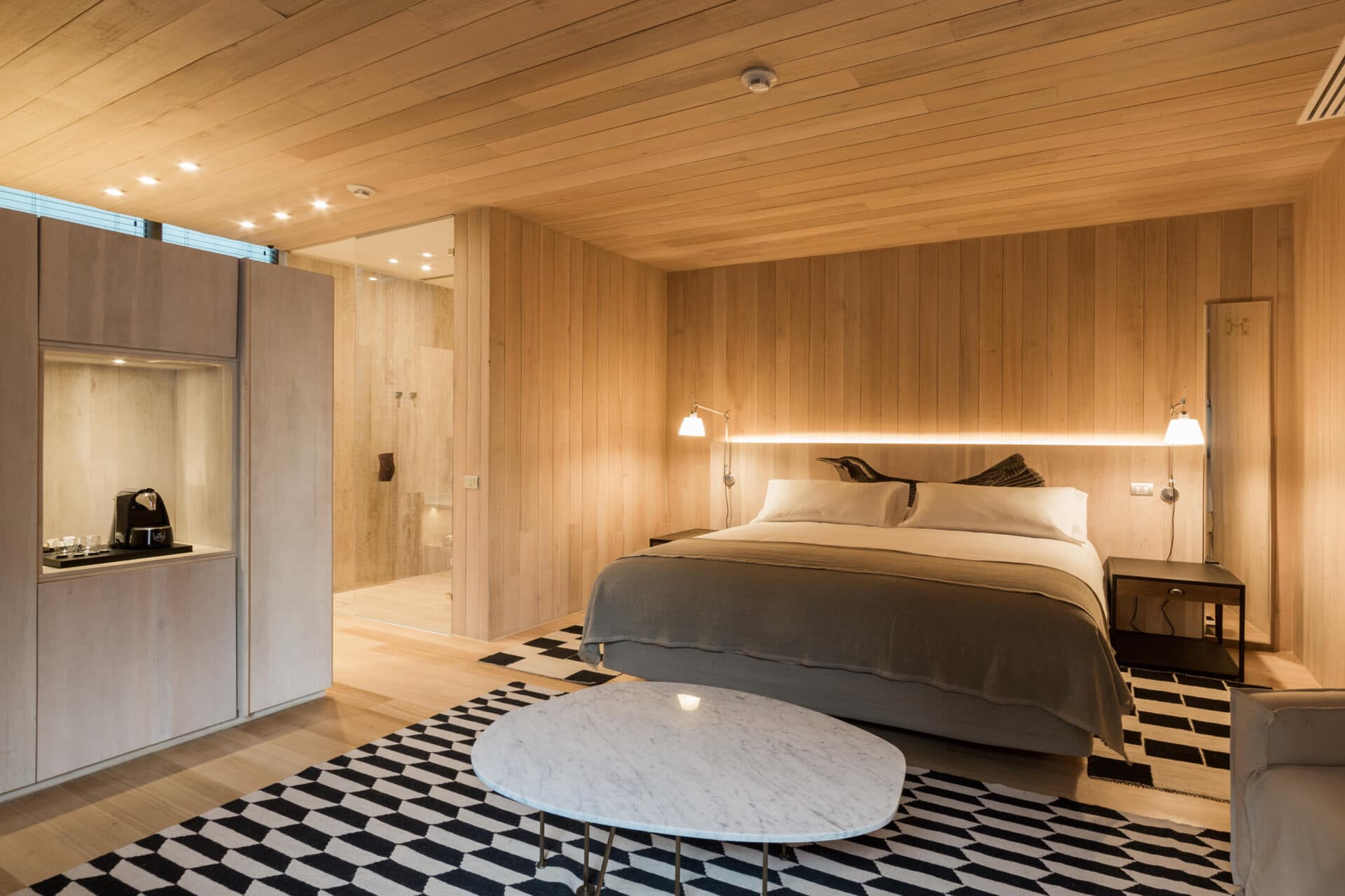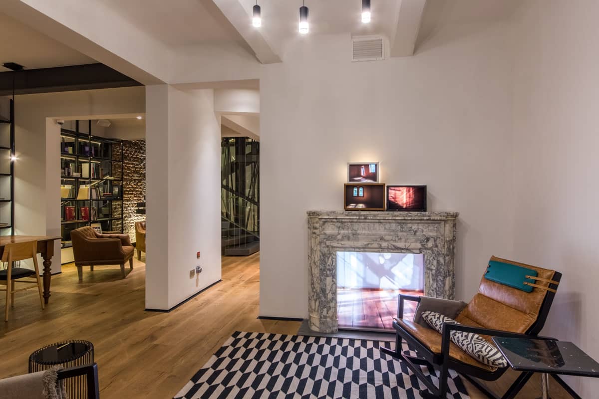 El desafío arquitectónico más importante de este proyecto estuvo en agregar tres nuevos pisos a un antiguo edificio patrimonial, que hoy cuenta con 42 habitaciones insertas en pleno casco fundacional de la ciudad. Una joya urbana que en su planta superior permite apreciar la inconmensurable riqueza del paisaje, con una vista única al Cerro Santa Lucía, el Cerro San Cristóbal y la gran cumbre tutelar de Santiago: el cerro El Plomo. Para que lo nuevo dialogara coherentemente con lo antiguo, se imprimió una fotografía del frontis original del edificio en una superficie de cristal que cubre los tres nuevos pisos. Un recurso efímero, traslúcido, y transparente que materializa esta sutil reinterpretación de la historia a través de un lenguaje contemporáneo. Además de esta renovación, se abrieron tres patios existentes y se construyeron dos nuevas escalas que se concibieron como patios de luz y pasillos acristalados capaces de iluminar todo el edificio. En las habitaciones, se ampliaron los espacios difuminando los límites, con baños que forman parte de la decoración, mientras que para rescatar un elemento fundamental del inmueble, se revistieron cielos y muros con el piso original del edificio.
