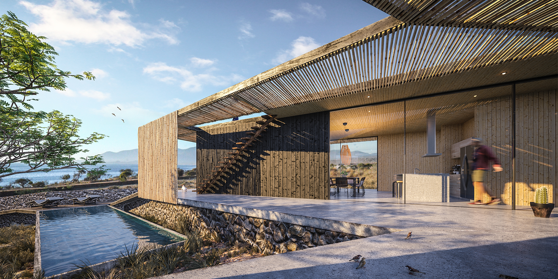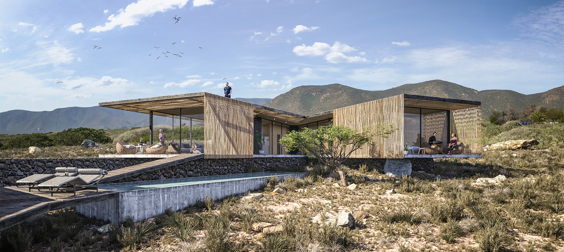 House V belongs to a series of 5 houses developed for the Las Mostazas Condominium with the purpose of facilitating the design and construction process of a house for anyone who wants to live there. This House, “Casa V”, opens to the landscape to integrate it into residence, separating the program into two environments: public and private.