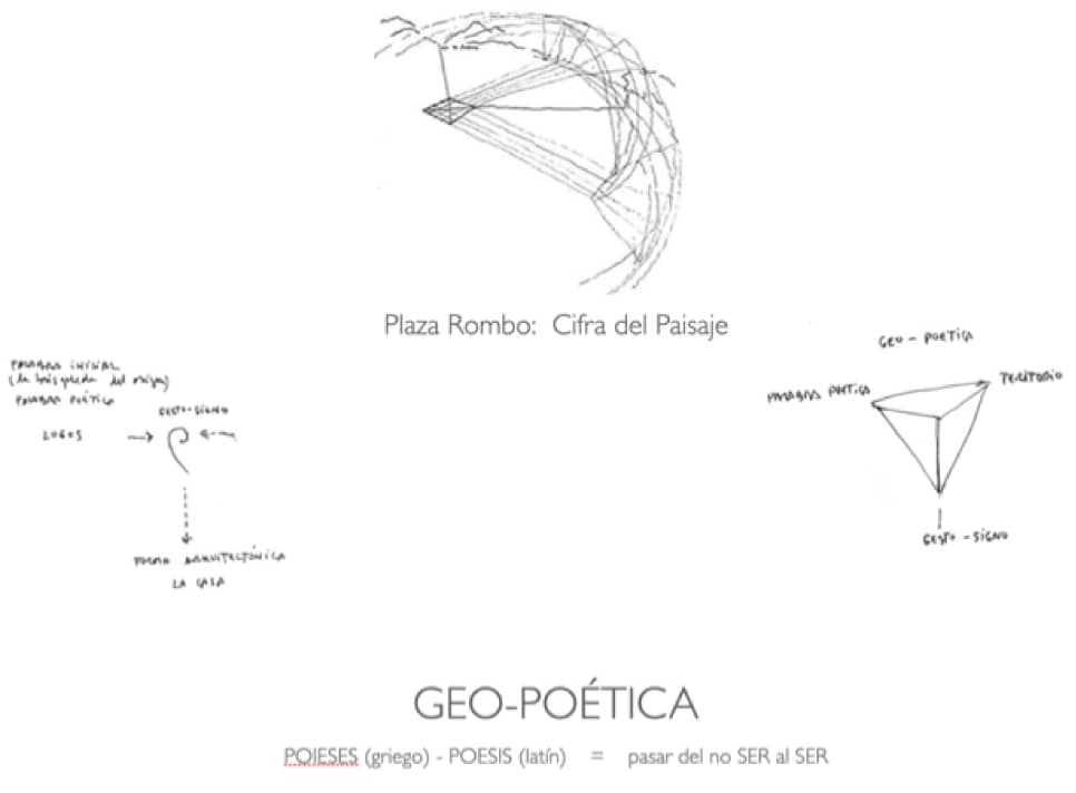 “Plaza de Rombo” que entrega una cifra del paisaje. La figura de rombo es capaz de desplegar el espacio, cuyo centro es definido por el observador, quien se presenta en el territorio para su análisis y dibujo del lugar. Aquí también nace la geopoética: un encuentro entre atributos geográficos que se observan y la palabra poética.